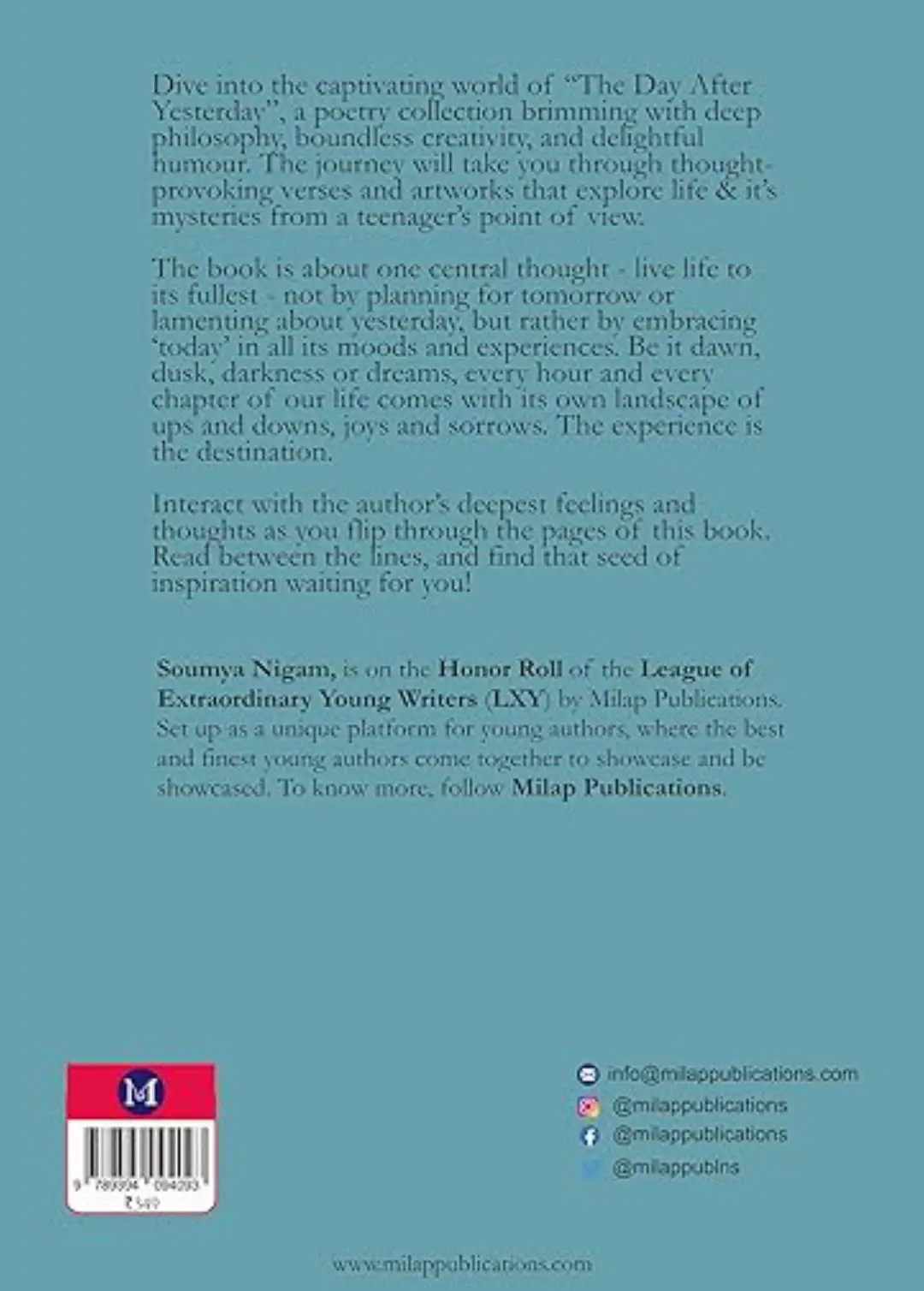 Soumya Nigam, is on the Honor Roll of the League of Extraordinary Young Writers (LXY) by Milap Publications. Set up as a unique platform for young authors, where the best and finest young authors come together to showcase and be showcased. To know more, follow Milap Publications. Dive into the captivating world of “The Day After Yesterday”, a poetry collection brimming with deep philosophy, boundless creativity, and delightful humour. The journey will take you through thought-provoking verses and artworks that explore life & it’s mysteries from a teenager’s point of view. The book is about one central thought – live life to its fullest – not by planning for tomorrow or lamenting about yesterday, but rather by embracing ‘today’ in all its moods and experiences. Be it dawn, dusk, darkness or dreams, every hour and every chapter of our life comes with its own landscape of ups and downs, joys and sorrows. The experience is the destination.